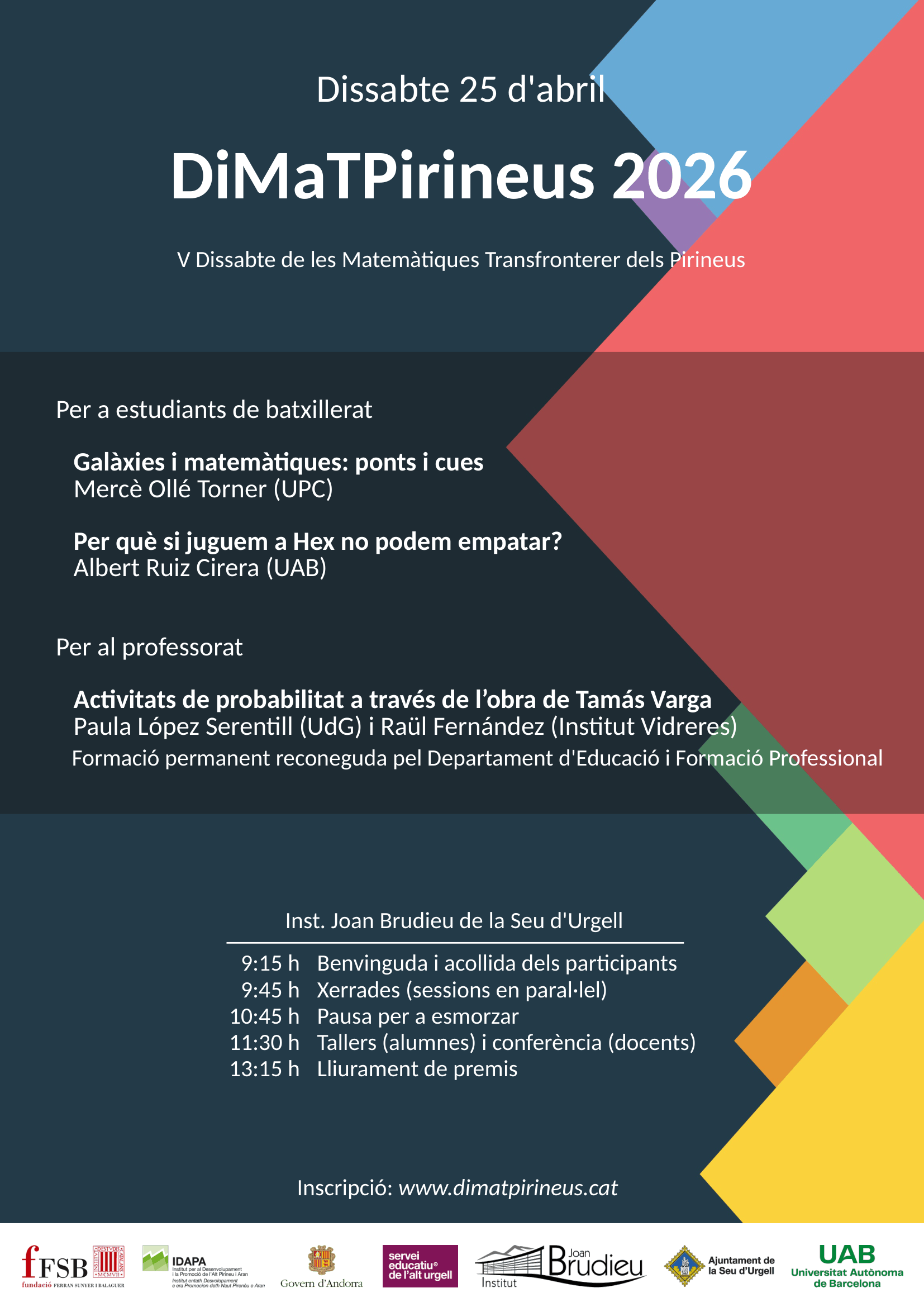 El Dissabte de les Matemàtiques Transfronterer dels Pirineus (V DiMaTPirineus – 2026) es tracta d’una activitat innovadora de matemàtiques que es realitzarà per cinquè cop a l’Alt Pirineu el 25 d’abril del 2026. Basant-nos en la bona acollida d’un projecte similar, el Dissabte Transfronterer de les Matemàtiques a l’Alt Empordà, que es realitza a Figueres des de fa 15 anys, organitzem el V DiMaTPirineus a l’Institut Joan Brudieu de laSeu d’Urgell. La participació és oberta als centres d’ensenyament de l’Alt Pirineu i Aran, del Principat d’Andorra, així com també a centres d’altres regions properes dels territoris de parla catalana.